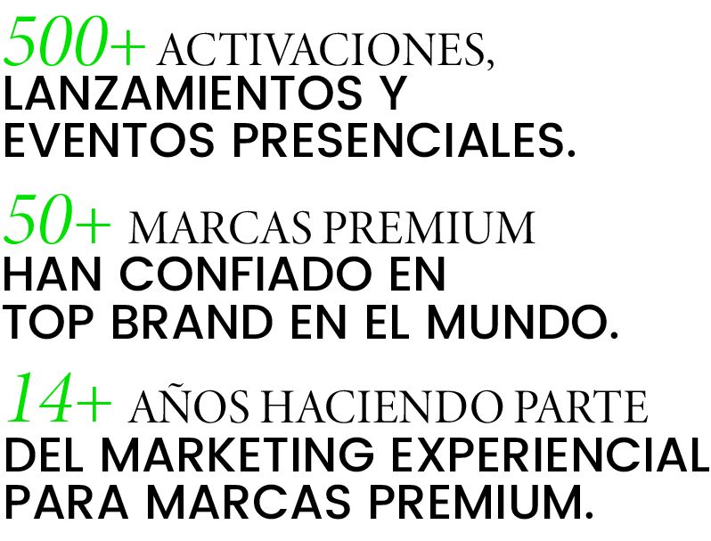 En Top Brand Worldwide™, transformamos ideas en experiencias y eventos inmersivos que cautivan audiencias y elevan marcas y empresas a nivel global.